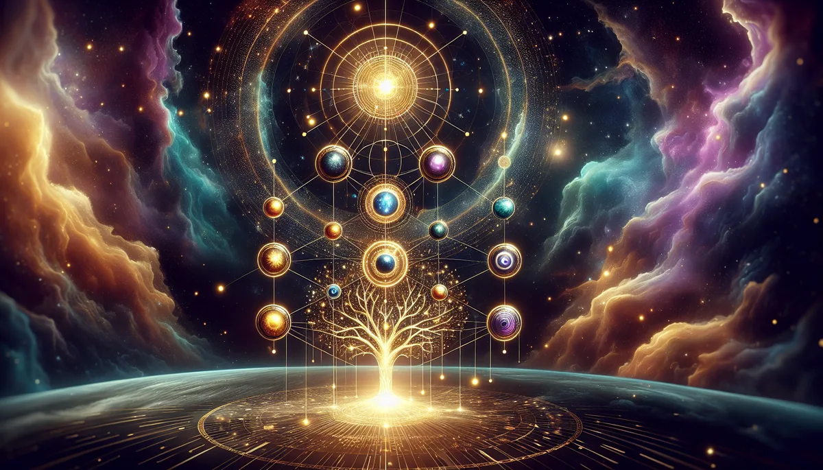 Kether(王冠)→ Chokmah(智慧)→ Binah(理解)→ Chesed(慈悲)→ Geburah(嚴厲)→ Tiphareth(美/和諧)→ Netzach(永恆/勝利)→ Hod(榮耀)→ Yesod(基礎)→ Malkuth(王國/物質世界)